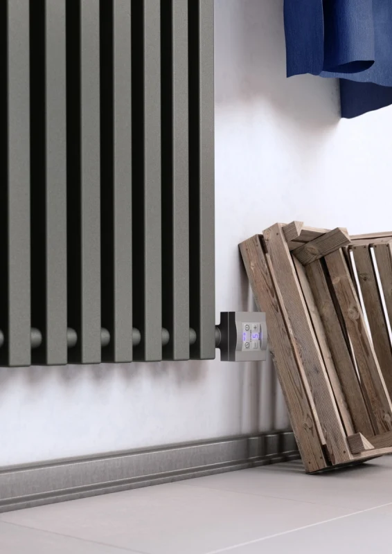 - Terma oil filled electric radiator supplied with the Terma KTX 4 Blue (Bluetooth) heating element – smartphone controlled, fully thermostatic element and a round clock face style head in matching silver.